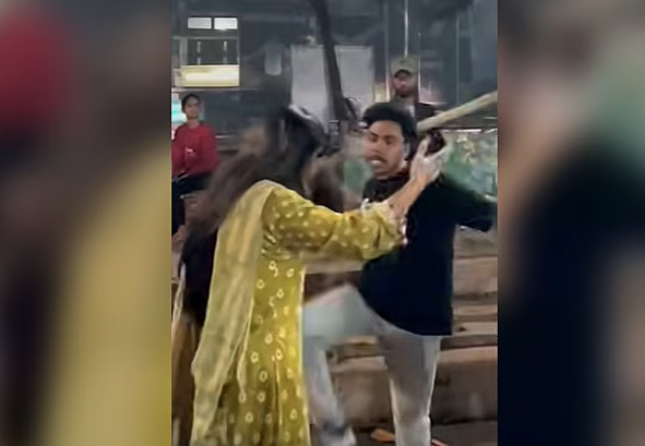 ঢাকা বিশ্ববিদ্যালয়ের টিএসসি এলাকায় বুধবার ভোররাতে নারীর দিকে তরুণের লাঠি হাতে তেড়ে যাওয়ার ভিডিও ফেসবুকে ছড়িয়ে পড়েছেছবি: ভিডিও থেকে নেওয়া